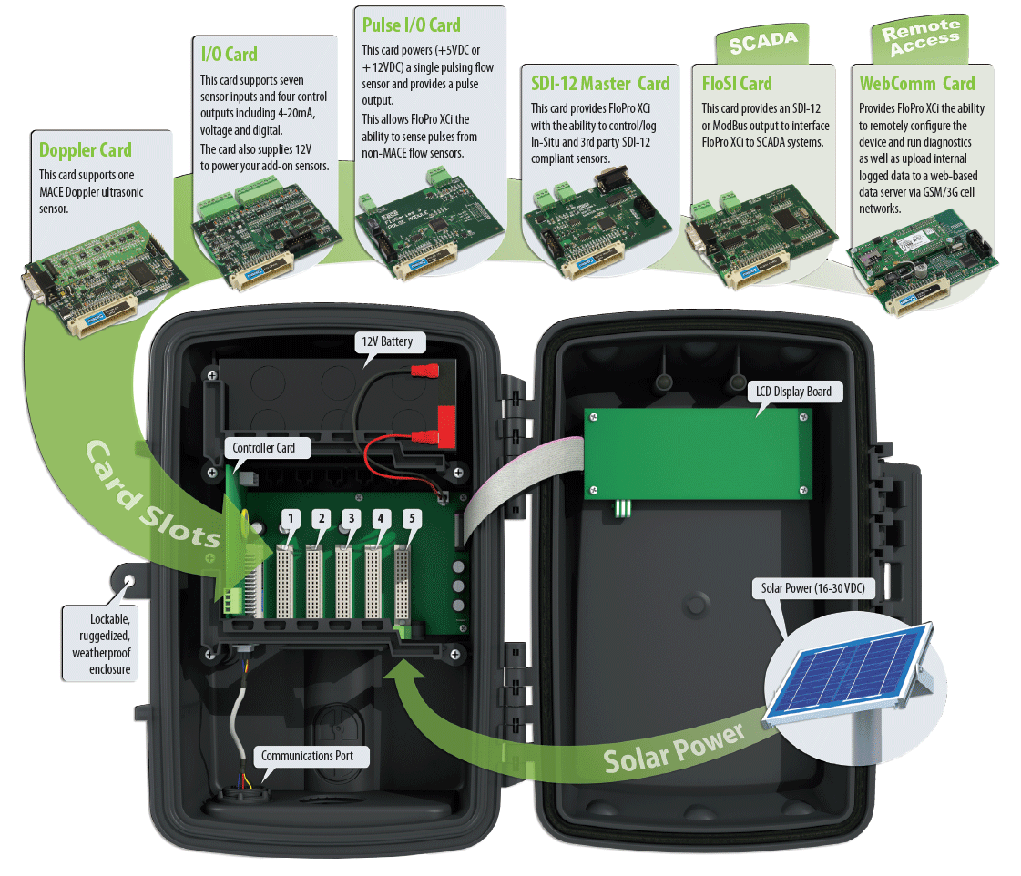 The XCi (multiple card interface) developed by MACE for the FloPro, AgriFlo and HydroMace allows the user to connect just about any sensor. Users can install any combination of the MACE FloSeries3 cards shown below, in the five available card slots of an XCi device. Choose the right card/s for your application to tailor the device to your exact monitoring requirements.